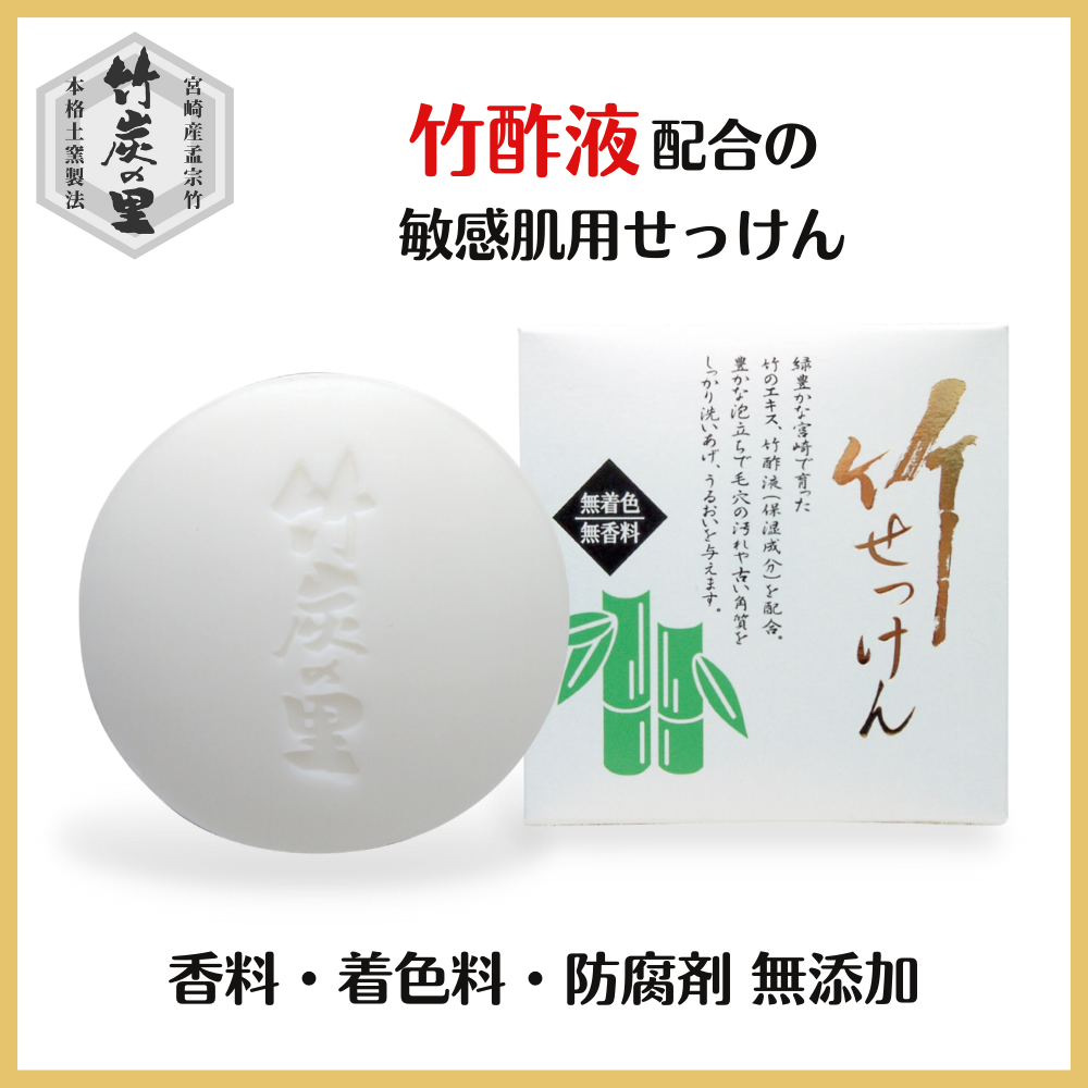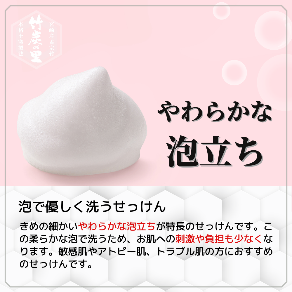 竹石けんは植物性の石けん素地をベースに竹酢液、ヒアルロン酸、スクワランといった天然成分で製造しており、エデト酸や防腐剤などは一切使用しておりません。